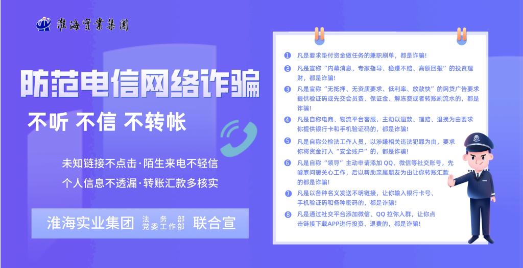 為切實維護職工群眾財產安全,提升電信網絡詐騙識別防范能力,連日來,淮海實業集團開展電信防詐騙宣傳活動。活動通過制作展板、宣傳海報、觀看宣傳片等方式,列舉近年來電信詐騙案例,介紹電信網絡詐騙的手段、特點和形式,讓職工群眾深刻了解電信網絡詐騙的危害,以及識別和防范措施。同時提醒公司職工要時刻保持頭腦清醒,增強安全防范意識,用實際行動維護自身合法權益。(劉強
