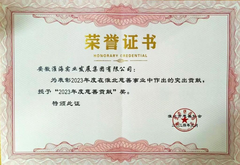 淮海實業集團榮獲淮北市“2023年度慈善貢獻獎”