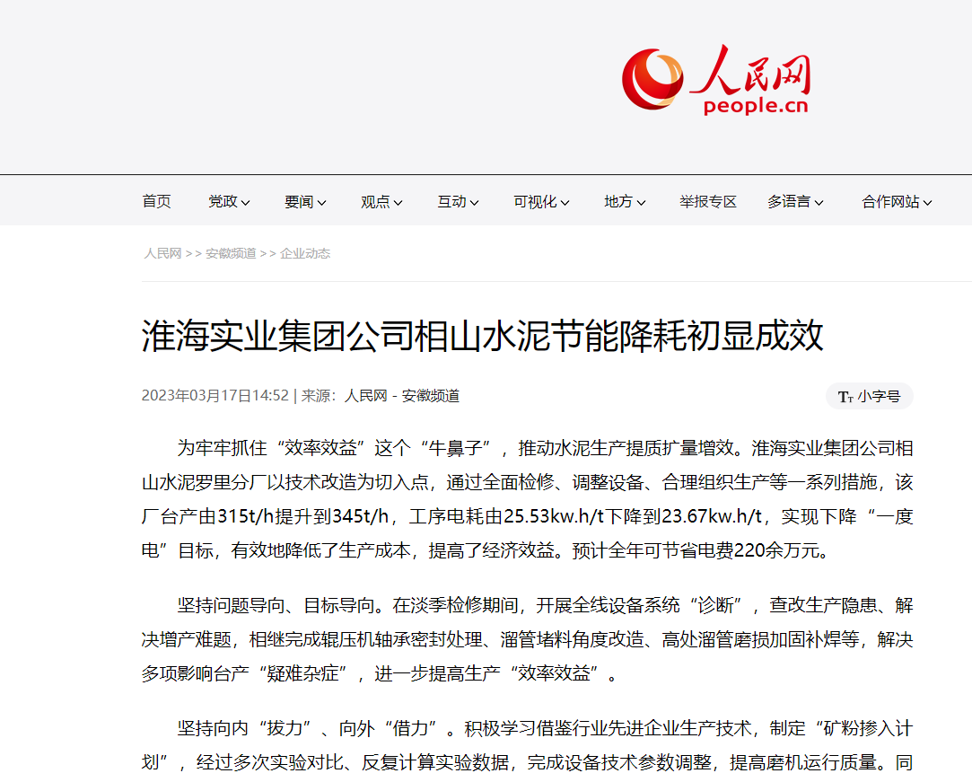 為牢牢抓住“效率效益”這個“牛鼻子”,推動水泥生產提質擴量增效。淮海實業集團公司相山水泥羅里分廠以技術改造為切入點,通過全面檢修、調整設備、合理組織生產等一系列措施,該廠臺產由315t/h提升到345t/h,工序電耗由25.53kw.h/t下降到23.67kw.h/t,實現下降“一度電”目標,有效地降低了生產成本,提高了經濟效益。預計全年可節省電費220余萬元。
