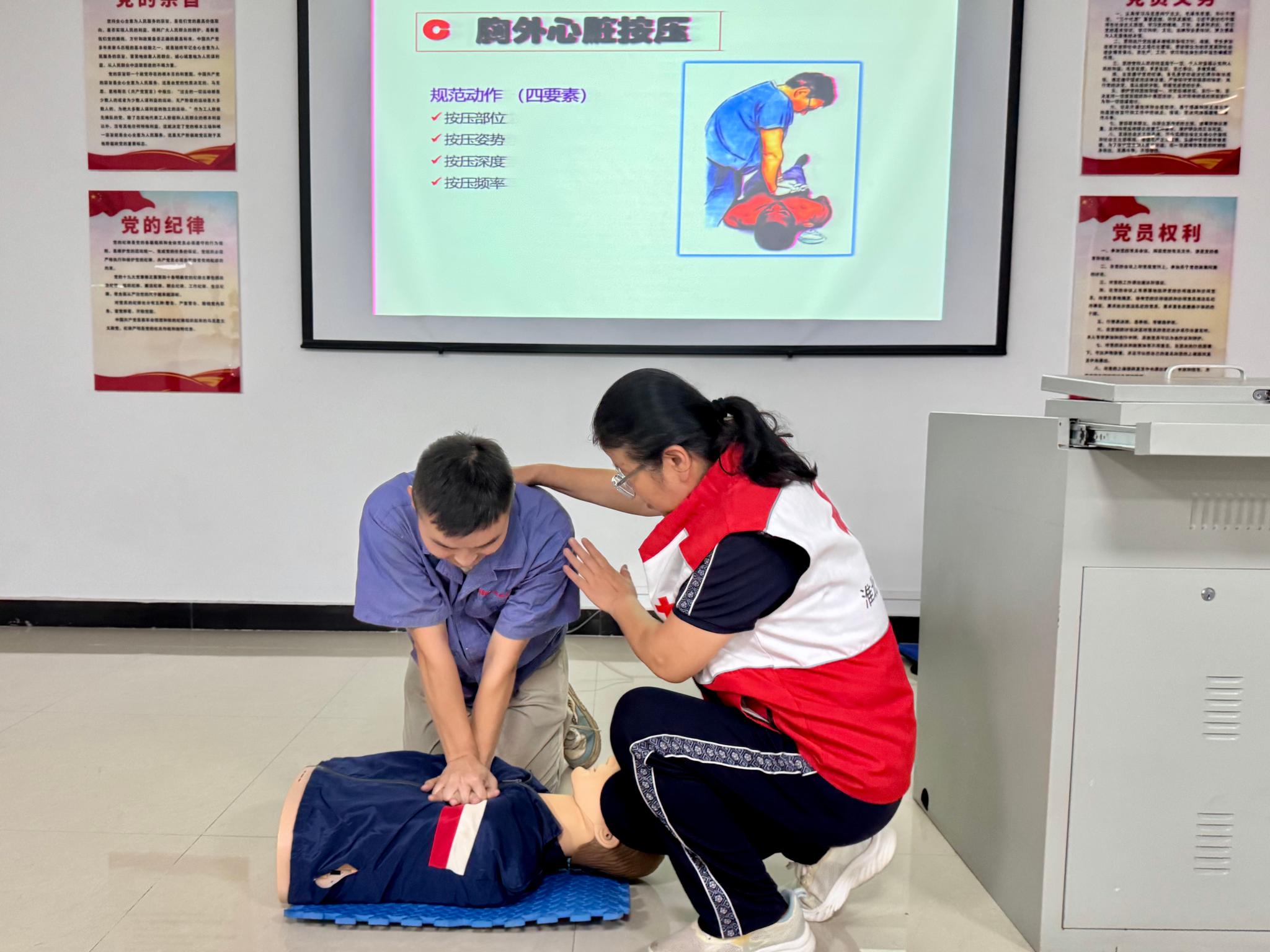 為確保技能“學得會、用得上”,李老師進行了規范、精準的動作示范。在其專業指導下,參訓職工們踴躍投入模擬練習。李老師全程密切觀察,對操作中出現的姿勢不標準、力度不到位、流程不清晰等問題逐一進行細致糾正,確保每一位職工都能準確理解技術要領,切實掌握急救技能的核心操作。