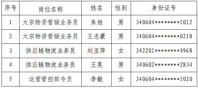 淮海物流公司于2023年1月11日開展招聘工作,經(jīng)過現(xiàn)場面試和考察,現(xiàn)將雙方達(dá)成就業(yè)意向、擬錄用人員名單公告如下:
