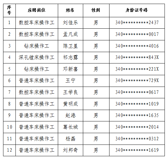 安徽省礦業(yè)機(jī)電裝備有限責(zé)任公司公開招聘面試工作已結(jié)束,按照計(jì)劃招聘招錄人數(shù)的1:1.2比例確定考察人選,根據(jù)面試情況,現(xiàn)將考察人選名單公布如下: