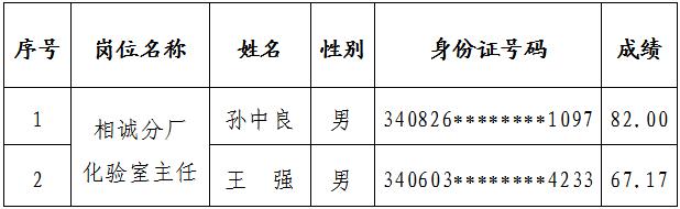 相山水泥公司相誠分廠化驗室主任招聘面試工作已結束,根據面試成績,確定2名考察人選?,F將考察人選名單公告如下: