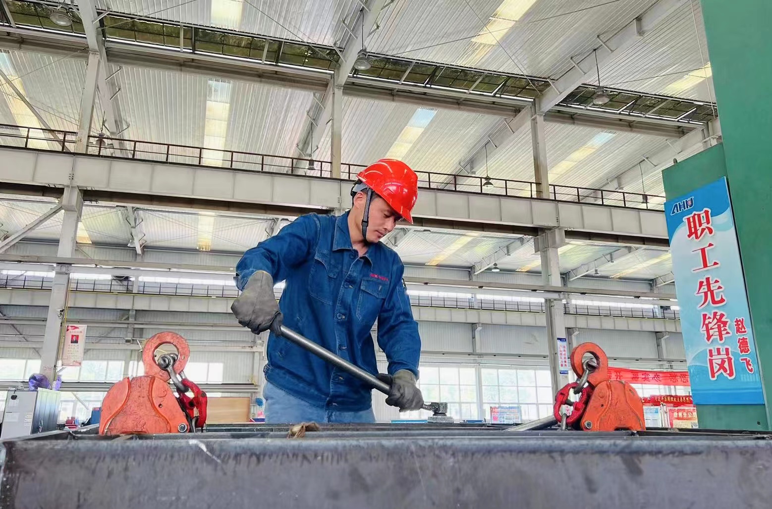 雙手緊握扳手,眼睛盯著長桿螺絲,在安徽礦機皮帶機車間鏜床前,趙德飛正聚精會神地進行工件裝卸操作。