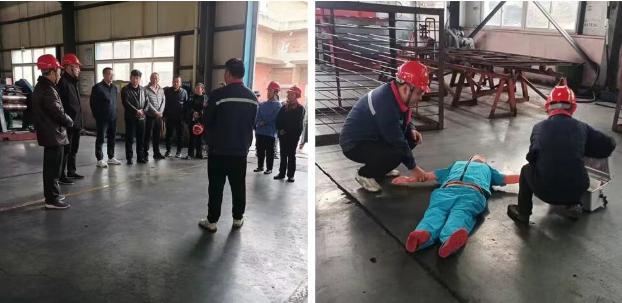 本次演練模擬了5T行車制動裝置突然失靈,導致現場人員“受傷” 的緊急場景。險情就是命令。公司應急小組迅速集結,10余名成員立即進入實戰狀態,協同出擊,有序救援。匯報組第一時間報告并撥打急救電話;疏散組高效引導人員撤離,拉起警戒線;救援組攜帶器材火速抵達,對“傷員”進行初步救治;指揮層立即啟動預案,現場指揮并按規定上報。整個流程環環相扣,忙而不亂,展現了高效的應急處理能力。