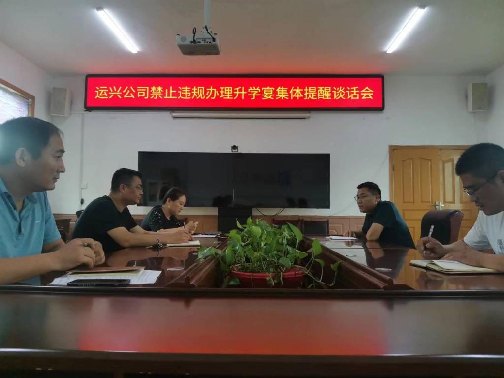8月2日,運興公司召開嚴禁違規操辦“升學宴”集體提醒談話會,對今年有子女參加中高考的黨員、干部開展集體廉政提醒談話,早提醒、早預防,提前打好“預防針”。會上,與會人員簽訂了《黨員干部不違規操辦升學宴請活動承諾書》,大家紛紛表示,將嚴格遵守相關要求和規定,弘揚勤儉節約、艱苦奮斗的優良傳統,自覺抵制不正之風,營造風清氣正的良好氛圍。(蔡燕)
