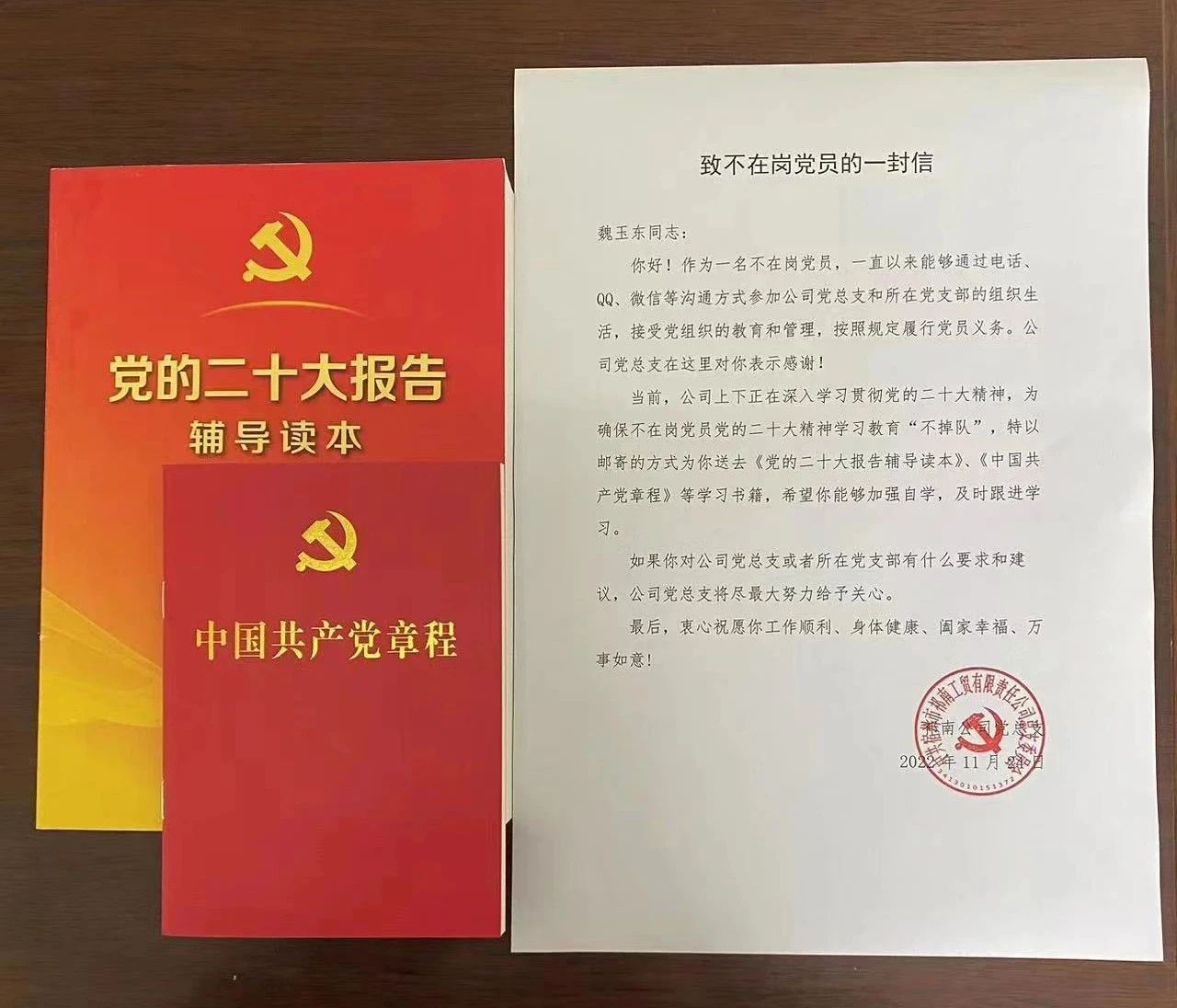 該公司黨總支分別走訪3位黨員,贈(zèng)與《黨的二十大報(bào)告輔導(dǎo)讀本》、《中國(guó)共產(chǎn)黨章程》等學(xué)習(xí)材料,并通過(guò)話發(fā)展、談變化,深入學(xué)習(xí)領(lǐng)會(huì)黨的二十大提出的新思想、新理論,作出的新部署、新要求,切實(shí)把思想和行動(dòng)迅速統(tǒng)一到黨的二十大精神上來(lái)。大家紛紛表示,要深刻認(rèn)識(shí)和把握此次大會(huì)的精髓實(shí)質(zhì),履行好新時(shí)代新征程的使命任務(wù),推動(dòng)黨的二十大精神在基層落地生根、開(kāi)花結(jié)果。此外,該黨總支還制作致不在崗黨員一封信,聽(tīng)取不在崗黨員對(duì)工作的意見(jiàn)和建議,鼓勵(lì)他們?yōu)楣景l(fā)展建設(shè)“支招”、出力。