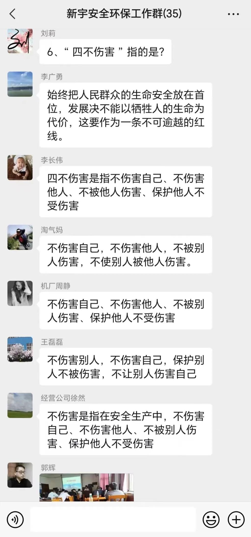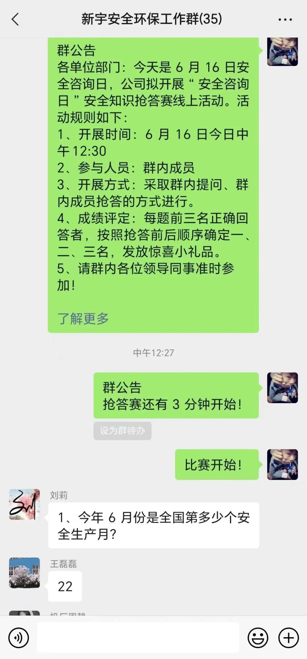 新宇公司創新活動形式,采取與職工線上互動問答的形式,開展安全知識問答,推動職工學習安全知識,形式新穎,趣味十足,吸引廣大干部職工踴躍參與。問答內容包含安全生產月、防災減災法律法規、應急管理、技能,引導廣大干部職工牢固樹立安全發展理念,嚴格落實安全生產主體責任,倡導安全文化,積極營造“我要安全、我會安全、我能安全”的濃厚安全氛圍。