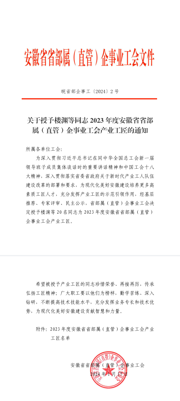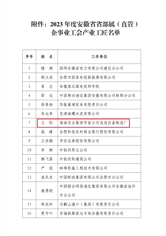近日,“2023年度安徽省省部屬(直管)企事業(yè)工會產(chǎn)業(yè)工匠”名單出爐。其中,淮海實業(yè)集團王創(chuàng)榜上有名。