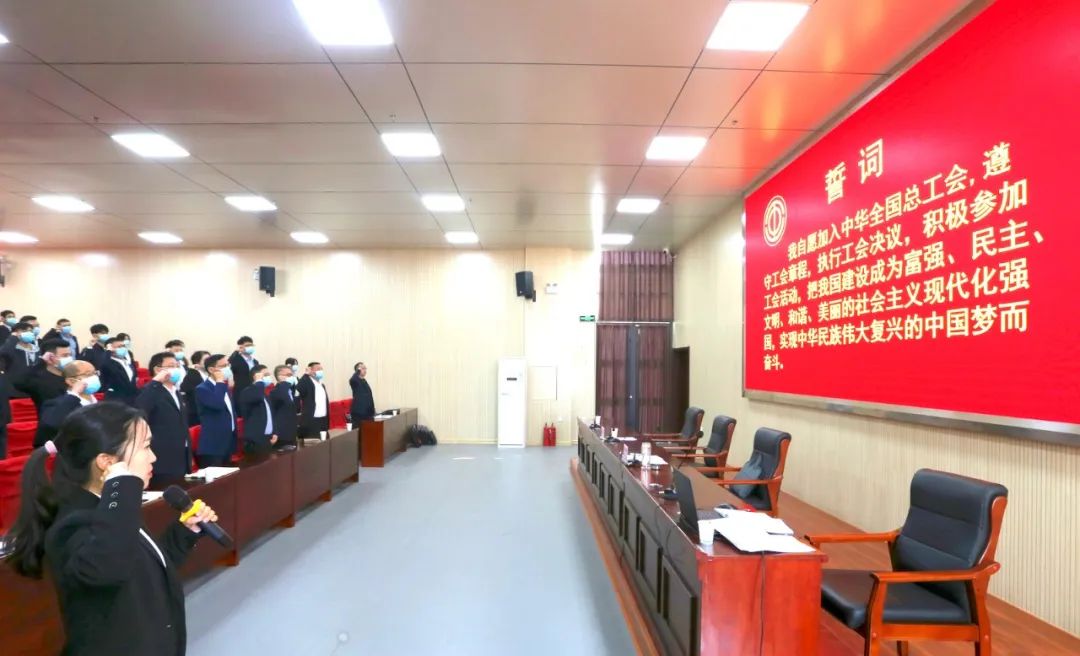 “我自愿加入中華全國總工會,遵守工會章程,執行工會決議,積極參加工會活動……”大家右手握拳過肩舉起,佩戴會徽莊嚴宣誓,正式成為了光榮的工會會員。