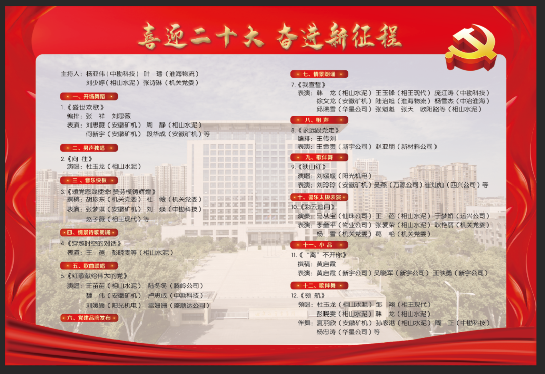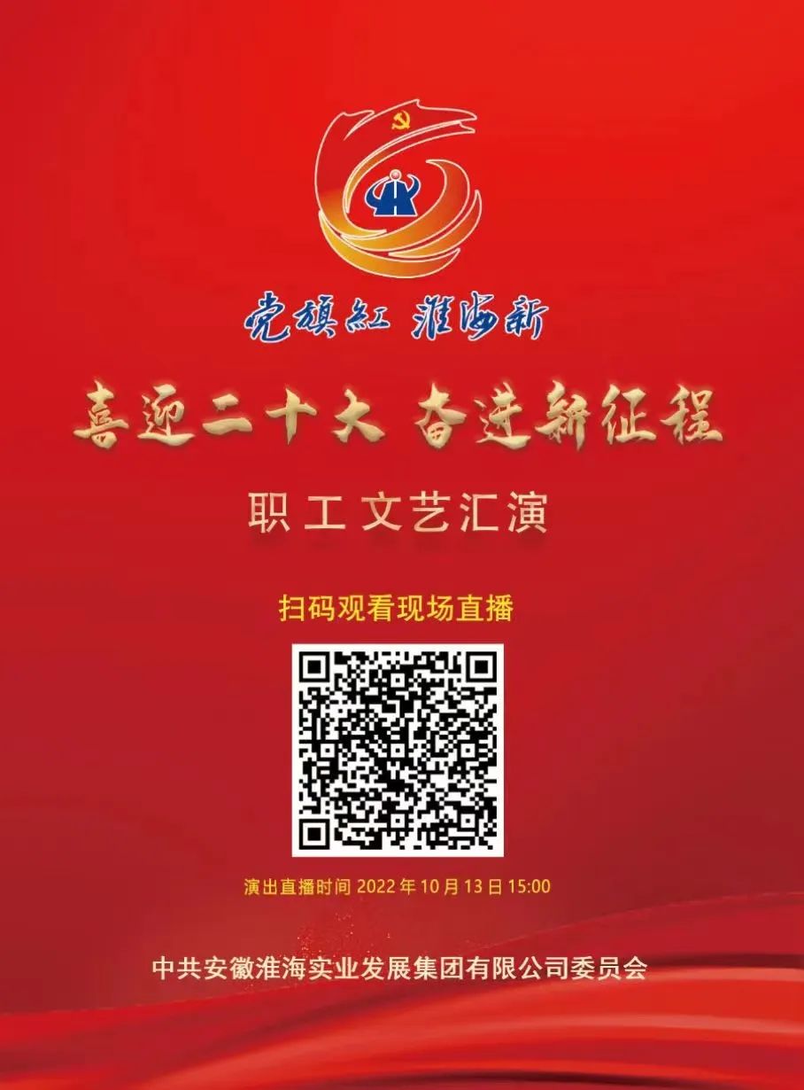 10月13日下午3:00,淮海實業集團將舉辦“黨旗紅?淮海新 喜迎二十大 奮進新征程”職工文藝匯演,迎接黨的二十大勝利召開,唱響新時代主旋律,展現職工新風采,激發干部職工以昂揚姿態奮進新征程、建功新時代。
