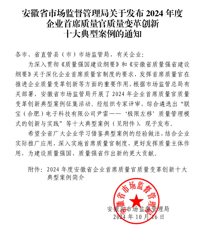 近日,安徽省市場監(jiān)督管理局發(fā)布“2024年度企業(yè)首席質(zhì)量官質(zhì)量變革創(chuàng)新”十大典型案例,淮海實業(yè)集團《“四層級”全員質(zhì)量管理模式》成功入選。